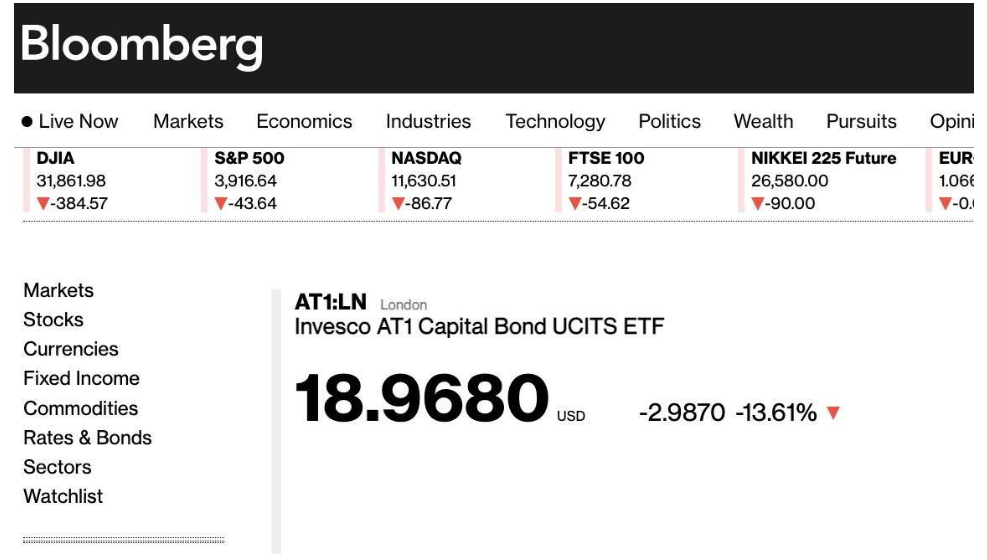 如果説讓沙特血虧,只是危及瑞士銀行市場信譽的話,那麼瑞士當局讓170多億美元AT1債券價值歸零,將直接打擊歐洲規模高達2750億美元的AT1市場,且給整個歐洲債務市場帶來“噩夢”。