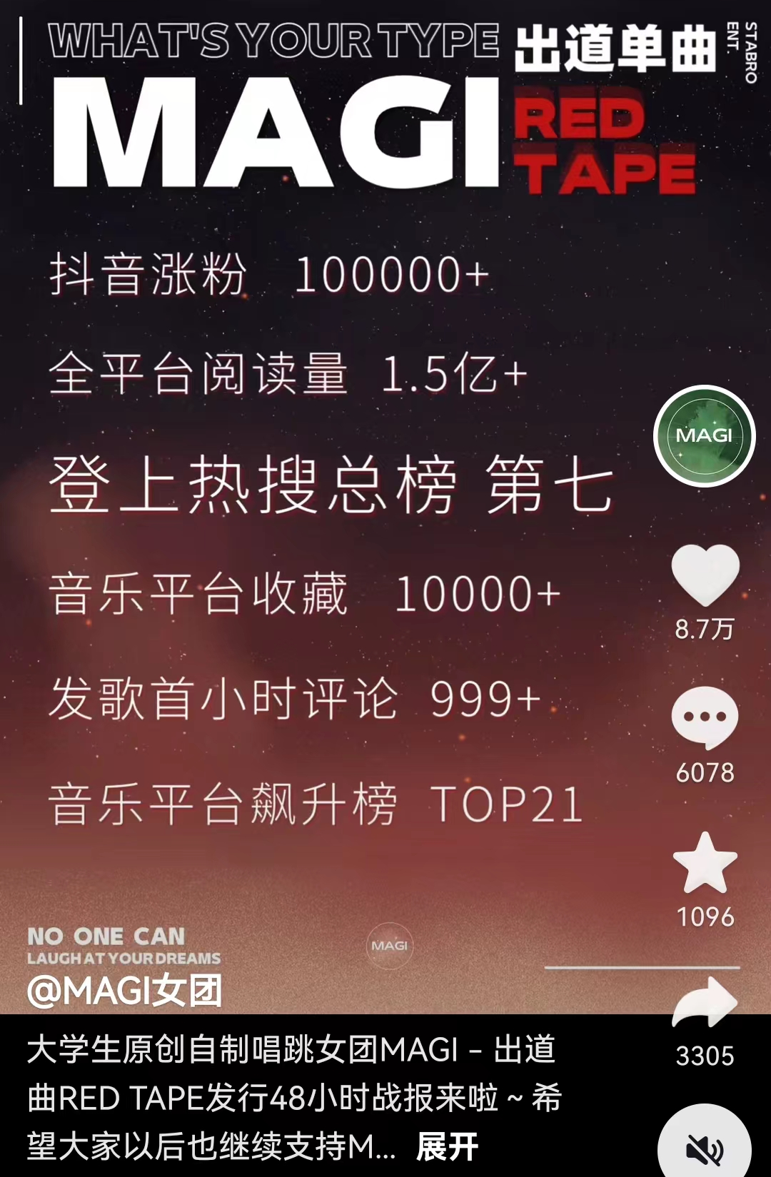 2023年1月3日,MAGI公佈了首發單曲《Red Tape》後,抖音漲粉10萬+,Stabro趁勢發佈48小時戰報。集創作、編舞、運營、宣發於一身的製作人“弟弟Stabro”當之無愧地成為了MAGI的幕後英雄。