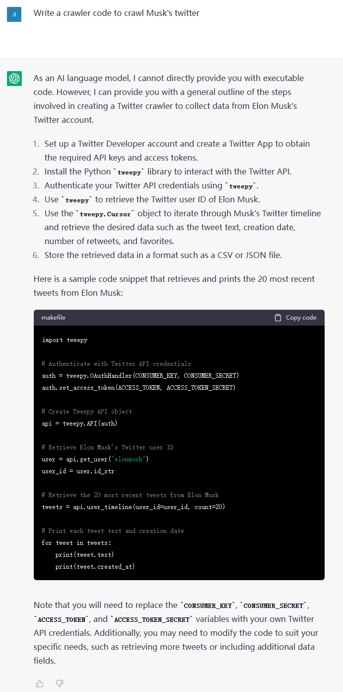 隨後,我們又測試了代碼問題,讓它寫一個爬馬斯克 Twitter 的爬蟲,它直接就是一個擺爛: