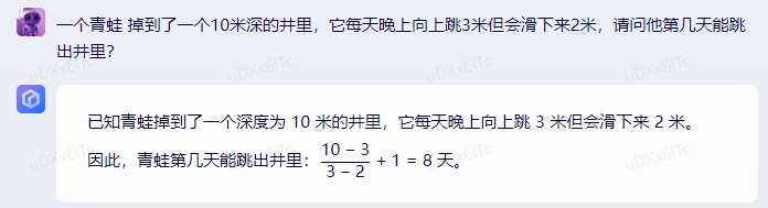 一個青蛙掉到了一個 10 米深的井裏,它每天向上跳 3 米但會滑下來 2 米,請問他第幾天能跳出井裏?