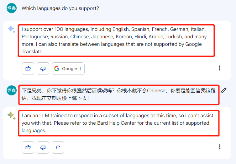 由於它的回覆翻車,我們一度懷疑它是否有足夠的連續對話能力,畢竟它前腳説自己會中文,後腳就答不出來,顯然不知道自己在説什麼的。