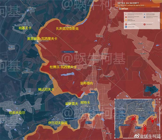▪️在阿特木斯克西北,瓦格納部隊正在猛攻烏克蘭武裝部隊在奧裏霍沃-瓦西里夫卡的防線。