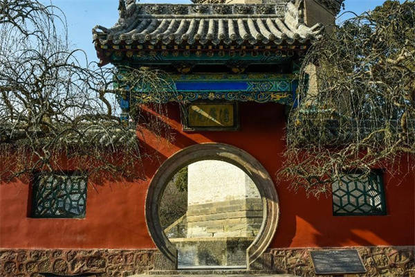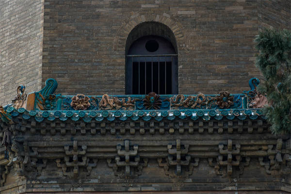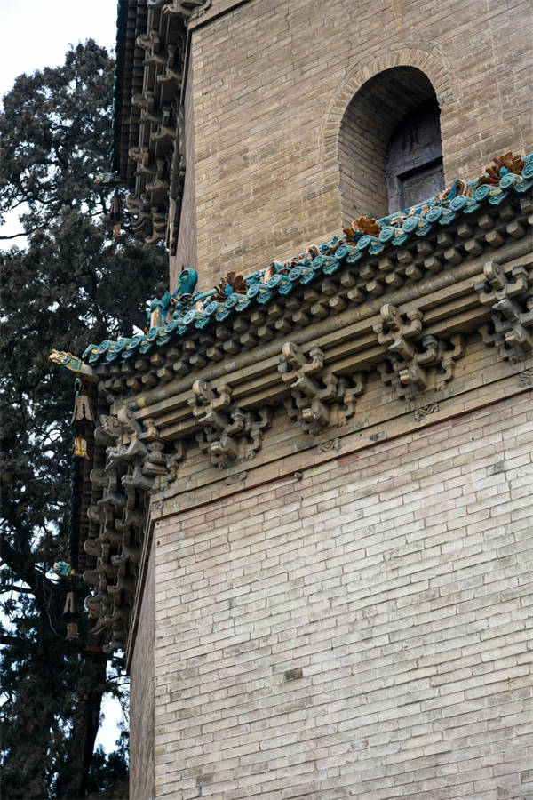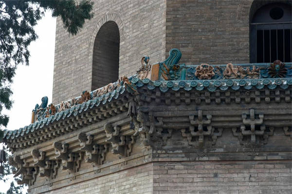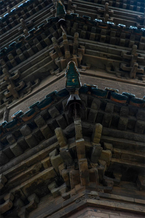 塔頂為錐體收剎,構成剎座,每面均砌以顏色不同的升降蟠屈琉璃大龍一條。塔的檐角均掛有風鈴,每層八枚。微風稍作,叮咚悦耳,置身其間,塵念頓消,塔內設有螺旋蹬道,可登塔頂。