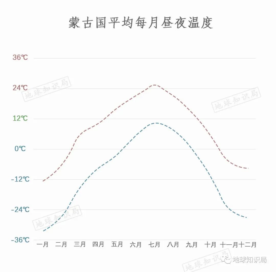 戈壁的地表形態讓太陽輻射極容易對地表的岩石造成影響,蒙古國的温度和氣候變化都極為劇烈。單日温差最高可達30℃,平均年冬夏温差巨大,部分地區年温差可逼近極端的90℃。比如烏蘭巴托周邊地區,冬季因極端低温而到—60℃,夏季因強烈日照和城市熱島效應達到30℃。