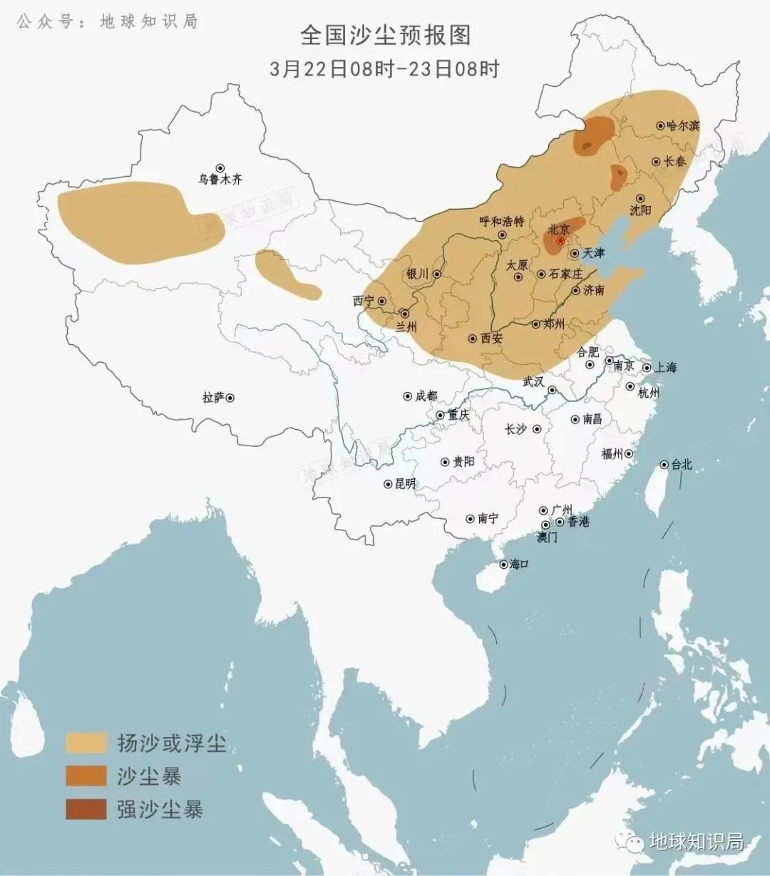 沙塵主體將於22日晚經過京津冀及周邊區域。受我國南方系統性降水過程影響,沙塵過程對淮河以南地區影響有限。本次沙塵過程影響,預計將於明天白天減弱並趨於結束。