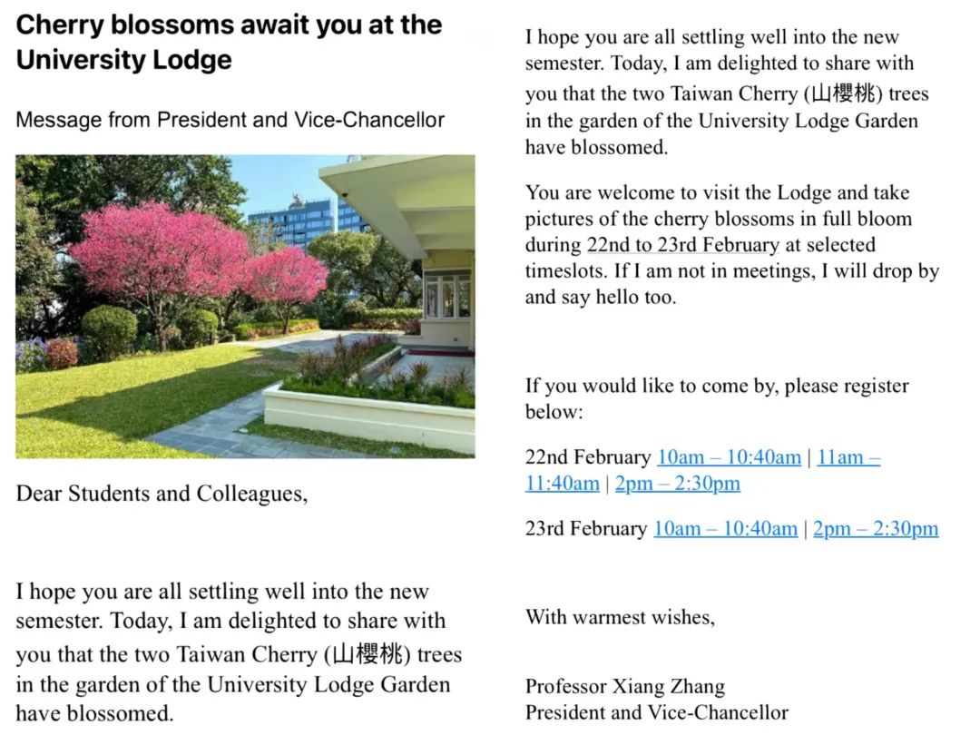 這個春天,香港大學校長張翔邀請學生到自家花園看櫻花,同學們紛紛“打卡”、曬圖。