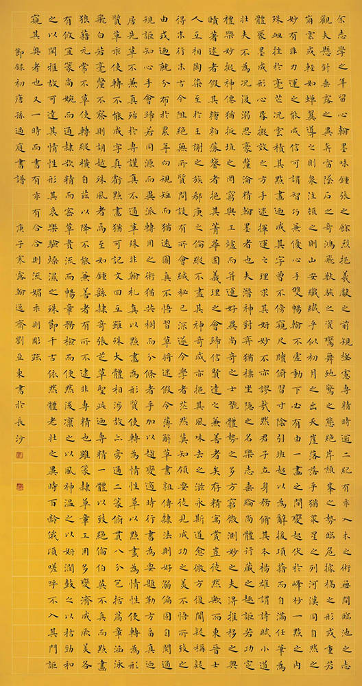 不是因為劉亞東是我師兄,我才不惜筆墨地寫他;不是因為我要寫劉亞東,才捧他,他的書法水平之高,是圈內外公認的。記得有一次,跟一位比較挑剔的書畫鑑賞名家聊當代書法家——更多的是他聊,我洗耳恭聽。興之所至,我從微信朋友圈找出數十個跟我關係不錯的書法家,翻出他們的作品,要他點評,並自告奮勇地承諾,請他挑出其中一個,我送他一幅書法作品。朋友認真地翻看完,挑了他不認識的劉亞東,並指明要劉亞東的小楷。給朋友看的那幾十個書法家,水平在圈內還是比較被公認的,實力很強。鑑賞家的選擇,印證了劉亞東的書法水平。
