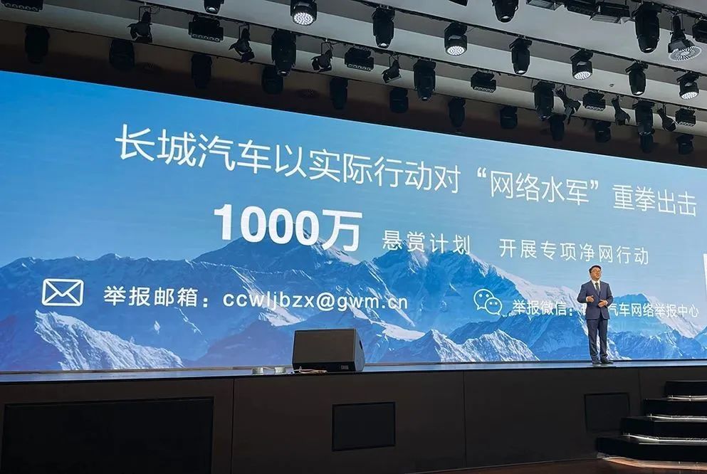 3月10日,長城汽車在自己舉辦的“智能新能源乾貨大會”上,懸賞1000萬打擊網絡水軍,目標直指某迪。在會上,長城汽車稱,已收到舉報信息500多條,主要涉及扭曲事實真相,無理由謾罵詆譭,民粹道德討伐,組團口水引戰等,在行業內形成劣幣驅逐良幣,部分資料已進入司法階段。