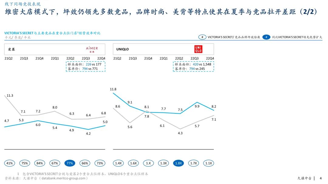 維多利亞的秘密早期通過超模大秀與夢幻、時尚、流量強綁定,市場定位中端,並針對年輕消費者推出PINK系列,打開市場,後期隨着性感經濟式微有所下滑;近期品牌重塑定位,跟隨市場趨勢推出反重力果凍條軟支撐、美背系列,產品策略與品牌營銷結合,一二線城市門店坪效領先