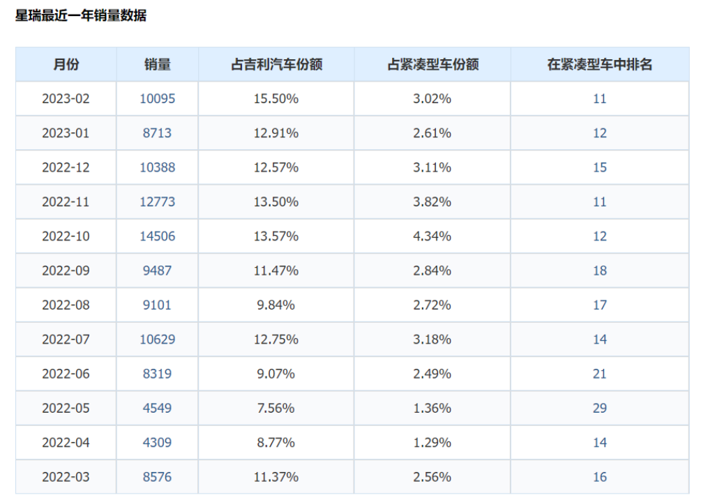 但新系統的加持似乎也沒能提振車型銷量。拿吉利星瑞舉例,去年中上市的2023款吉利星瑞全系車型均搭載了吉利銀河OS智能車機系統,但其銷量仍舊與此前相差不大,並且在整個賽道上銷量也一直未進入前10。