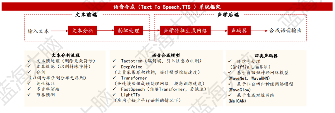語音合成(Text To Speech, TTS)是一種將文本轉換為語音的技術,賦予機器像人一樣自如説話的能力,是人機語音交互中重要的一環。語音合成系統分為文本前端和聲學後端兩個部分。文本前端主要負責在語言層、語法層、語義層對輸入文本進行預處理,如為文本添加韻律信息,並將文本詞面轉化為語言學特徵序列。聲學後端可以分為聲學特徵生成網絡和聲碼器。聲學特徵生成網絡根據文本前端輸出的信息產生聲學特徵。聲碼器利用頻譜等聲學特徵,生成語音樣本點並重建時域波形。近年來出現的端到端語音合成系統則將聲學後端合併為一個整體,可直接將語言學特徵序列,甚至字符直接合成語音。