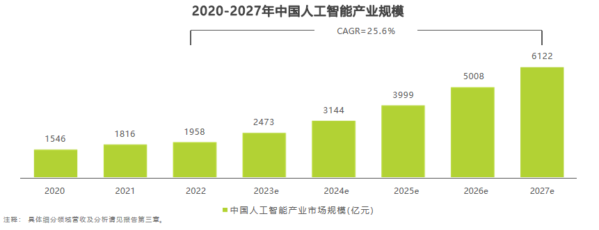根據艾瑞的定義,我國人工智能產業規模涵蓋AI應用軟件、硬件及服務,主要包括AI芯片、智能機器人(商用)、AI基礎數據服務、面向AI的數據治理、計算機視覺、智能語音與人機交互、機器學習、知識圖譜和自然語言處理等核心產業。預計到2022年,中國人工智能產業規模將達到1958億元,年增長率為7.8%,整體平穩向好。2022年的業務增長主要依靠智算中心建設以及大模型訓練等應用需求拉動的AI芯片市場、無接觸服務需求拉動的智能機器人及對話式AI市場,除此之外的增長動力將在第三章詳細闡述。目前,中國大型企業基本都已在持續規劃投入實施人工智能項目,未來隨着中小型企業的普遍嘗試和大型企業的穩健部署,在AI成為數字經濟時代核心生產力的背景下,AI芯片、自動駕駛及車聯網視覺解決方案、智能機器人、智能製造、決策智能應用等細分領域增長強勁。預計到2027年,人工智能產業整體規模可達6122億元,2022-2027年的相關CAGR為25.6%。