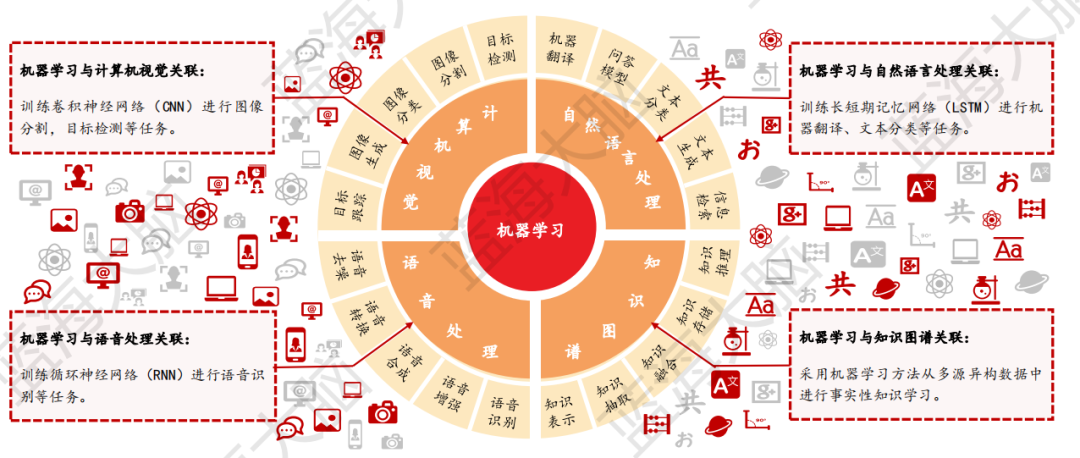 機器學習作為人工智能技術的核心,近年來實現了明顯的突破。它與計算機視覺、自然語言處理、語音處理和知識圖譜等關鍵技術緊密結合,相關機器學習算法主要應用於圖像分類、語音識別、文本分類等相關場景中。這些應用場景的不斷發展和完善,不僅提升了人工智能技術的整體應用效果,也使得人工智能技術在金融、醫療、交通等各領域實現了廣泛的應用。