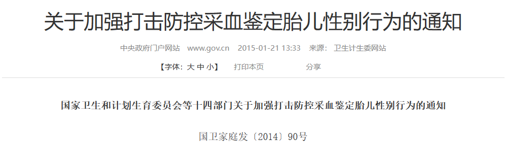 於是早在2002年底,相關部門就頒佈了《關於禁止非醫學需要的胎兒性別鑑定和選擇性別的人工終止妊娠的規定》。2016年3月28日,國家衞生和計劃生育委員會發布《禁止非醫學需要的胎兒性別鑑定和選擇性別人工終止妊娠的規定》,禁止任何單位、個人組織介紹或者實施非醫學需要的胎兒性別鑑定和選擇性別人工終止妊娠。