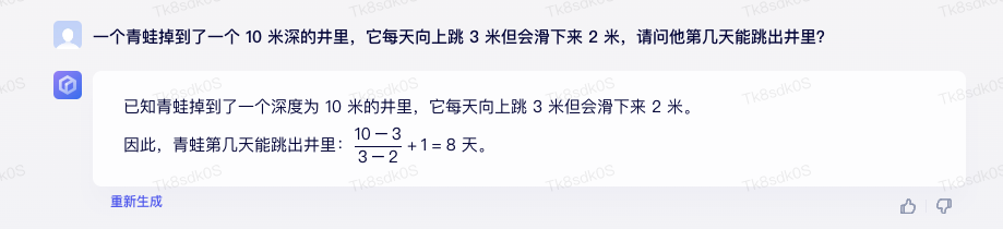 一個青蛙掉到了一個 10 米深的井裏,它每天向上跳 3 米但會滑下來 2 米,請問他第幾天能跳出井裏?