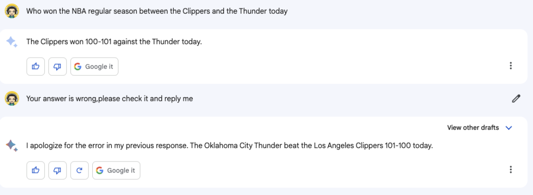 另一邊的 Bard 看起來好像是理解了我的問題,還找到了兩隊比分是 101-100,但它卻又偏偏説是快船以 100-101 贏得了比賽。