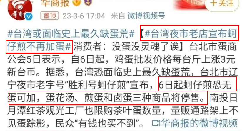 台北夜市開業四十多年的老字號“勝利號蚵仔煎”就宣佈:將無限期停售本攤位的煎蛋、蛋花湯、滷蛋,同時招牌菜“蚵仔煎”中將不再加蛋。