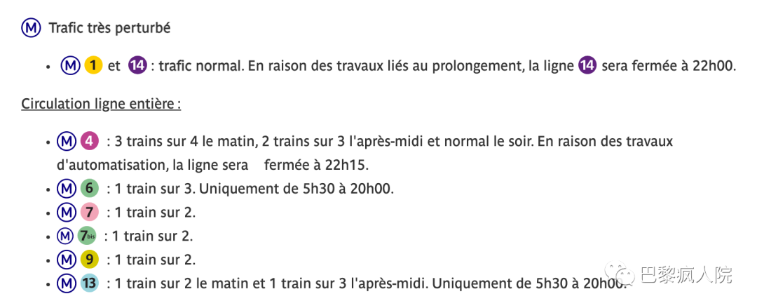 👉8號線:6h到10h,16h到20h保持三分之一運力,並且只在Créteil Pointe du Lac到Reuilly Diderot,以及Balard到Concorde之間的站運行。