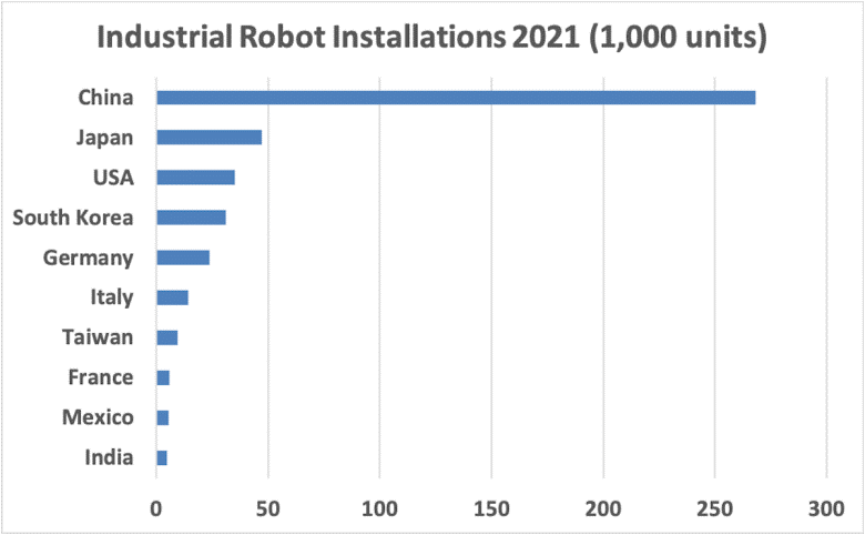 2021年各主要經濟體工業機器人新增裝用數量(數據來源:IFR)