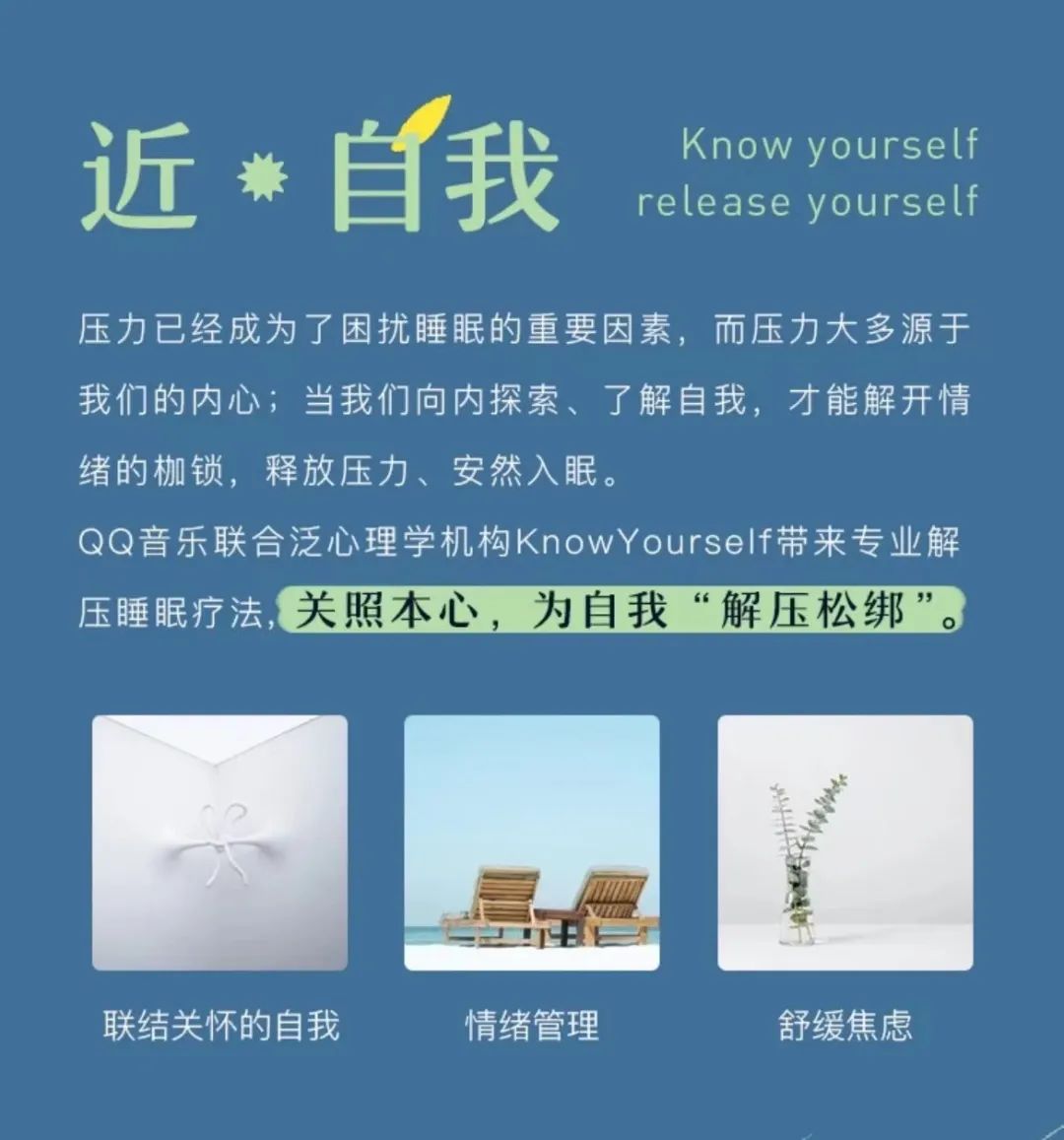 基於“近·自我”的理念認同,泛心理學機構KnowYourself帶着多年深厚的心理學背景以及與大眾密切溝通的經驗在今年的睡眠日全新加盟,聯合QQ音樂甄選出品質療愈內容。在舒緩温柔的人聲中,從《聯結關懷的自我》出發,經由一次次專業的新冥想練習,學習《情緒管理》方法,找尋到自己與外界的《愛與鏈接》。讓紛亂的想法和焦慮的思緒緩緩被稀釋,放下雜念,放空大腦,幫助睡眠困難羣體找回“睡眠自由”。