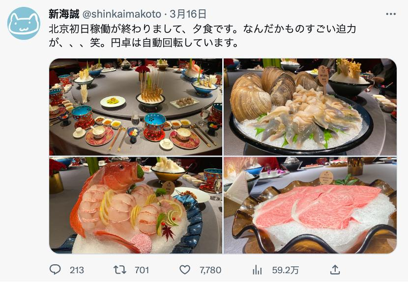 近日,新海誠曬出的“中韓接待餐標對比”,也在社交媒體上發酵了一波熱度,網絡熱梗間接助推電影在中日韓出圈。其票房號召力也間接解釋了《鈴芽之旅》大熱的原因。有着較為龐大的粉絲基礎,作為宣發主力擔當的新海誠,究竟憑什麼被如此偏愛?