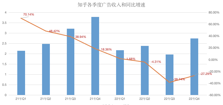 2022年Q4知乎廣告收入2.75億元,同比減少27.29%,但降幅略低於三季度,整體呈逐季放緩趨勢。