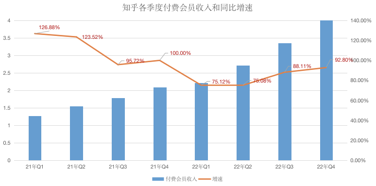 不過,知乎的付費會員營收和增速都有所提升。付費會員收入4.03億元,同比增加92.8%,但貢獻整體營收的36.18%,佔比較上季度略有下降。