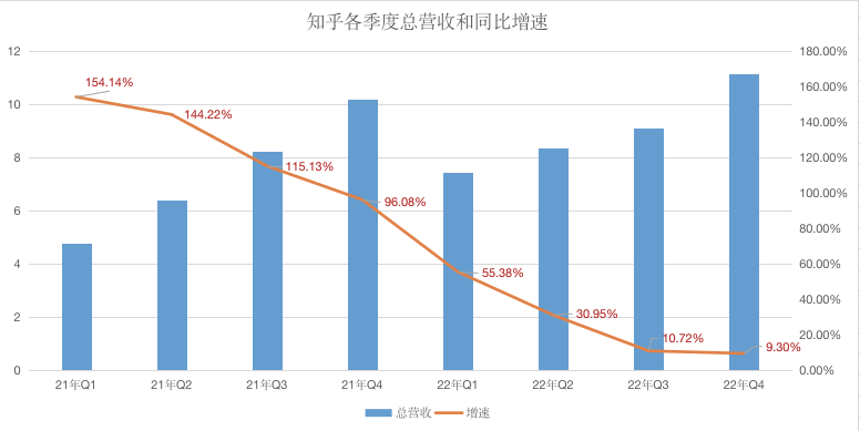 具體到2022年Q4,知乎營收11.14億元,同比增長9.3%,這是公司全年營收同比增速最低的一個季度。