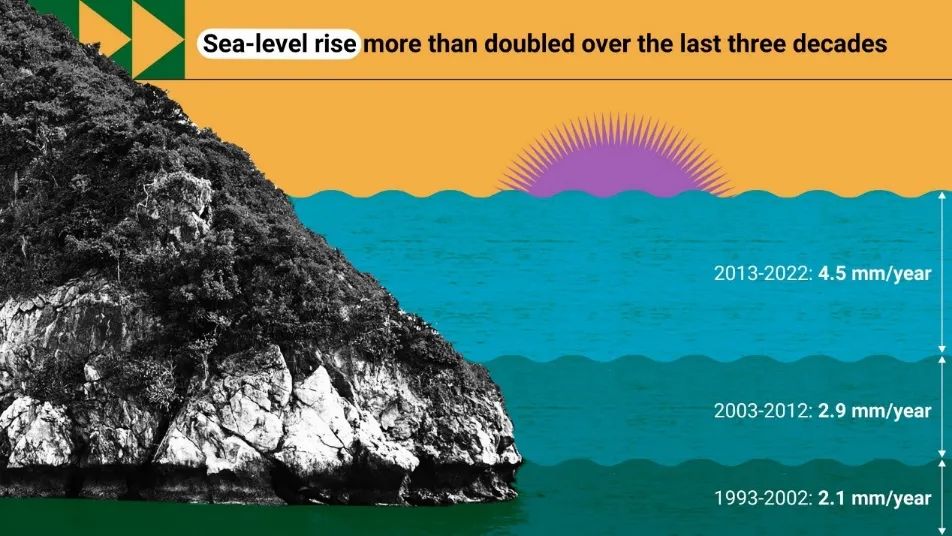 過去 10 年間,海平面上升的高度(45.0 毫米)接近之前 20 年的總和(50.0 毫米)。圖片來源:WMO