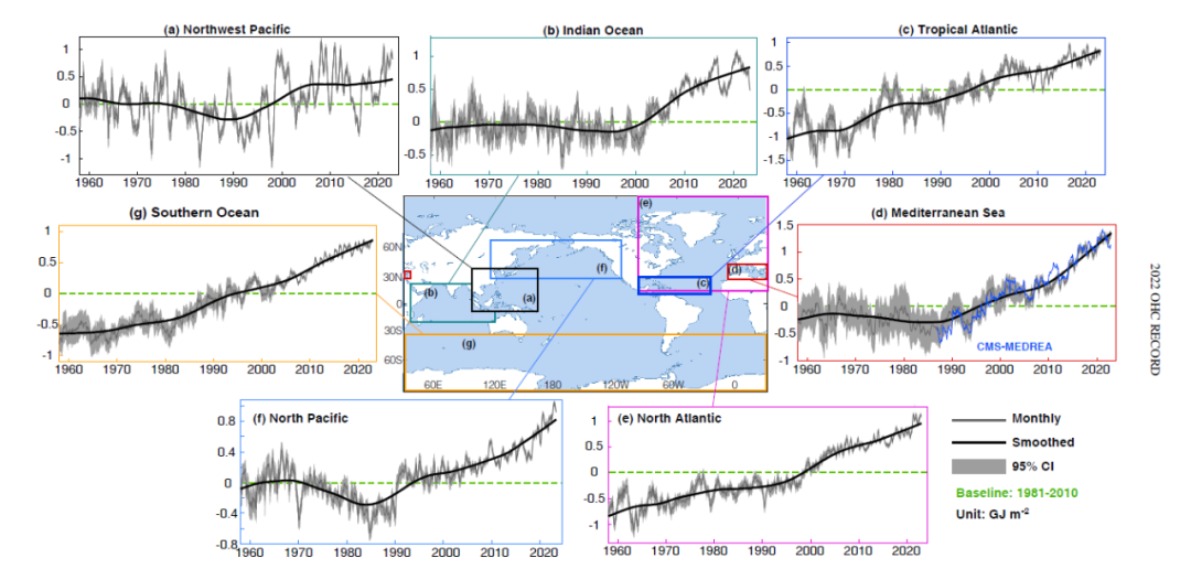 相對於 1981~2010 年基線,1958~2022 年區域觀測到的 2000 米上部熱含量變化。圖片來源:參考文獻[3]
