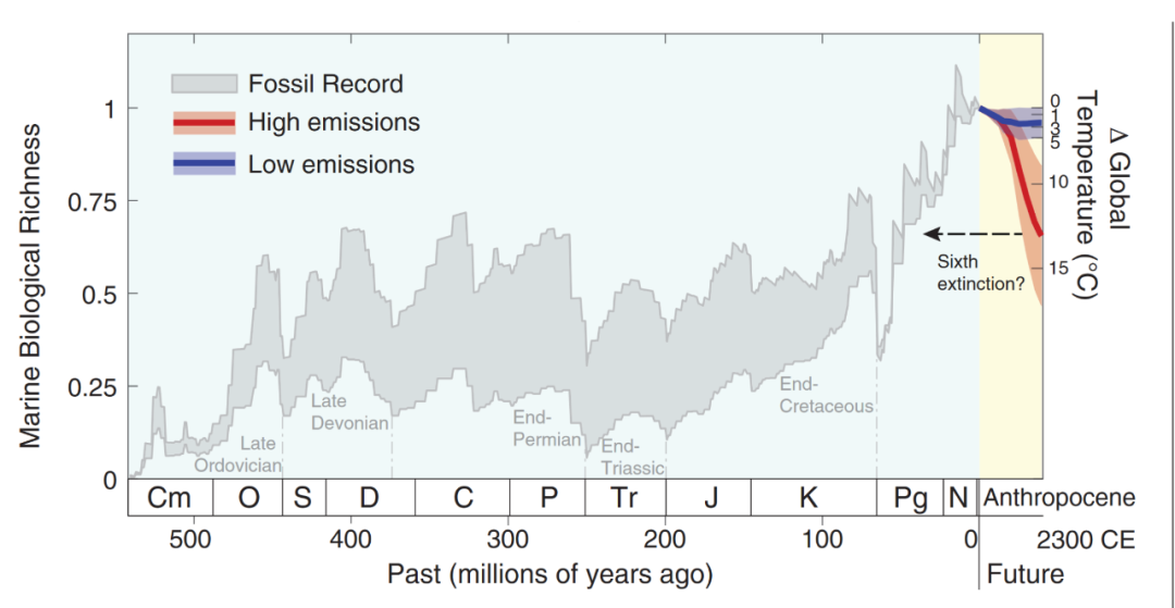 2022 年,科學家們的研究進一步表明,如果人類對温室氣體沒有采取行之有效的減排行動,將使地球在 2300 年走上二疊紀末期大規模海洋物種滅絕(這一事件被稱為“物種大滅絕”,導致 96% 的海洋物種和 70% 的陸地物種消失)的道路。這其中,極地物種滅絕的風險最高,但熱帶地區的生物豐富度下降得更多。