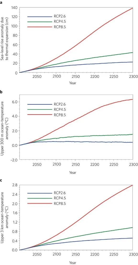 由於熱膨脹導致的全球海平面上升距平和海温距平(與平均值的差)。a,全球年平均海平面上升距平(相對於 1986~2005 年);b,全球 300 米海温年均距平(相對於 1986~2005 年)。c,全球3000米海温年均距平(相對於 1986~2005 年)。圖片來源:參考文獻[10]