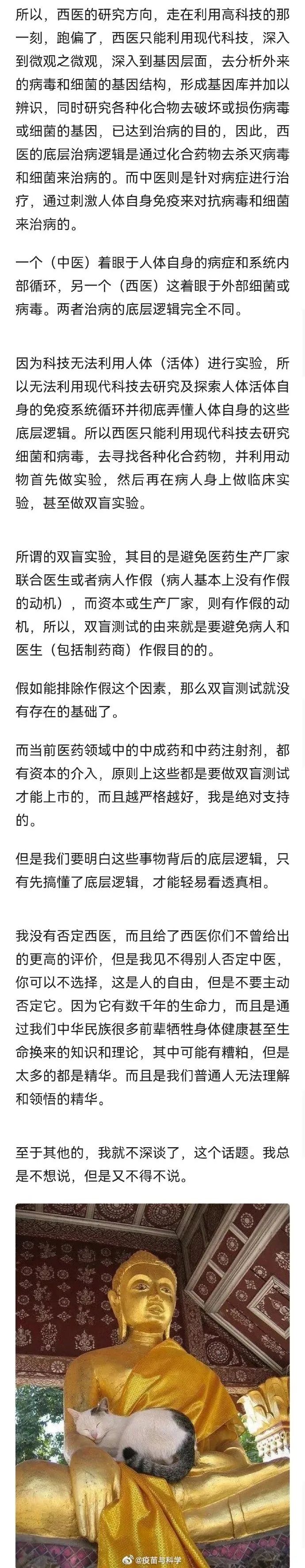 有人在今日頭條寫了一篇發人深省的文章,認為西醫跑偏了,中醫才從更高級或者更底層邏輯上洞悉了人體的真相,所以中醫可以擺脱雙盲試驗的限制,或者説評價中醫的療效不能使用西醫的雙盲對照試驗。