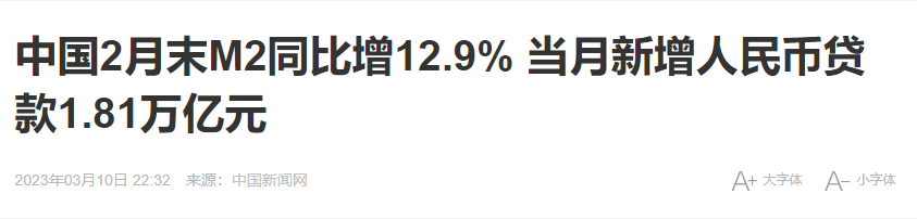 2022年底,中國M2為266萬億元,2023年2月的M2為275萬億元,僅僅增加9萬億元,增長率僅為3.3%,完全在7%以內。
