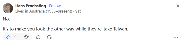 懷疑吧。世界上發生的和涉及美國的所有事情都在顯示你們這些天有多麼軟弱,所以他們肯定不會費盡心思去做這些事情,只是為了讓你們知道(又一次)你們有多麼軟弱。就像重提阿富汗的潰敗或疫情的數字或最近墨西哥人越過邊境的情況一樣,既便宜又有效。也許還可以拋出一些儲存在總統車庫裏的秘密文件,哈哈。或者我猜未能將俄羅斯驅逐出烏克蘭,但西方仍然過於宣傳,無法實現這一目標。