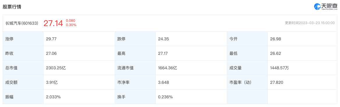 股市方面,長城汽車在A股更是從2022年1月的48元左右,在磕磕絆絆中一路跌至20元至30元區間,甚至在2022年3月底還險些跌破20元。甚至通過天眼查可以發現,截至今年3月23日,以27.14元收盤的長城汽車仍舊沒能恢復到去年年初的水平。