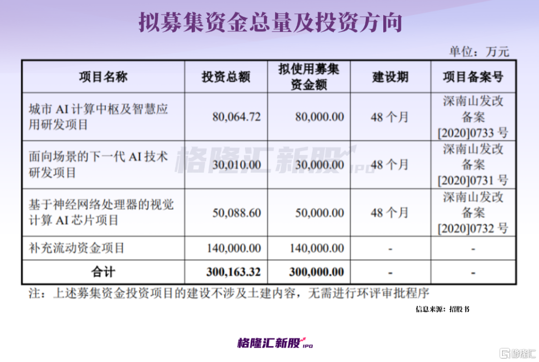 從募資用途來看,雲天勵飛本次上市擬募集資金用於城市AI計算中樞及智慧應用研發項目、面向場景的下一代AI技術研發項目、基於神經網絡處理器的視覺計算AI芯片項目、補充流動資金。