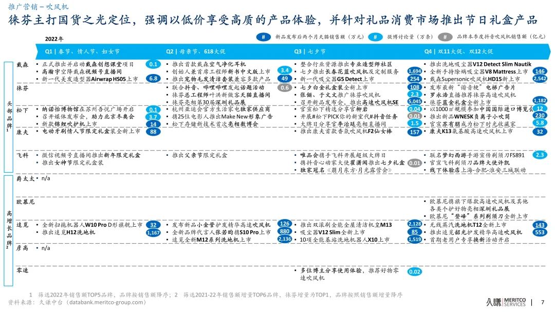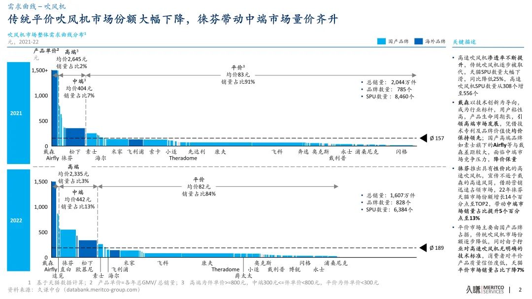 隨着高速吹風機普及率提高,技術日益成熟,中端價格段產品佔據更多市場份額,徠芬推出具有性價比的高速吹風機,宣傳不遜於戴森的高速風筒,藉助營銷迅速佔領市場,22年徠芬天貓市場份額增長14個百分點至TOP2,帶動中端市場銷量佔比提升5個百分點,推動高速吹風機賽道均價下移(天貓市場2022年均價1,046元 vs 2021年均價2,053元)