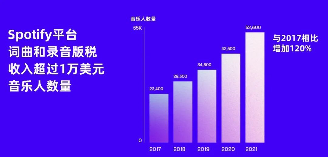 以 Spotify 2021 年統計的數據為例,有 350 組在兩年間發表第一首作品的音樂人獲得了 10 萬美元的版税收入。