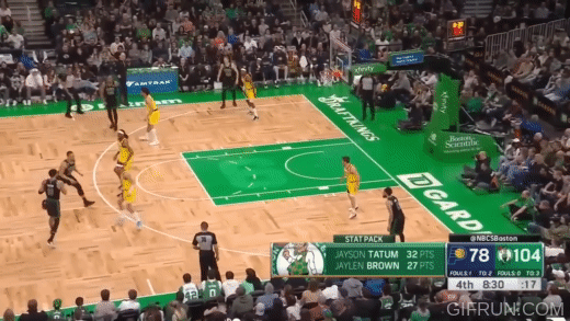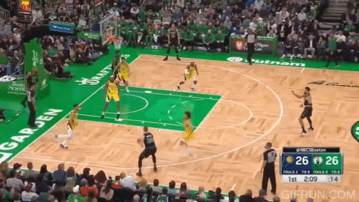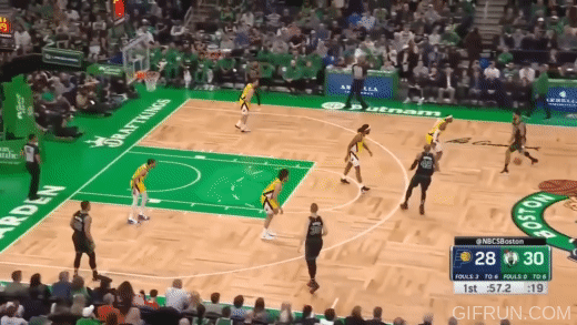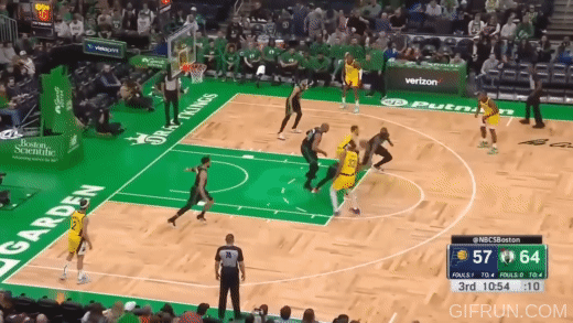 霍福德與斯瑪特合力防守,眼看要抄球;塔圖姆提前啓動,大步流星,等接球時,一個快攻已經形成了。