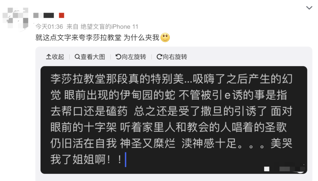 這幅模樣,像極了《黑暗榮耀》中吸毒後的李莎拉。