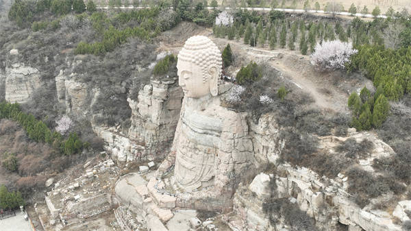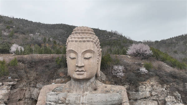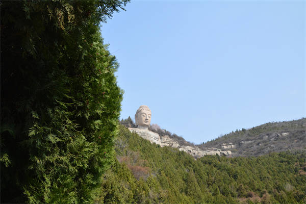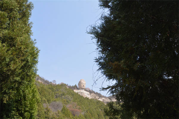 蒙山大佛開鑿於南北朝北齊天保二年,即公元551年。由文宣帝高洋開始歷經5位皇帝,24年鑿成。《北齊書》對當時鑿佛有記載雲:“鑿晉陽西山大佛像,一夜燃油萬盆,光照宮內。夜則以火照作,寒則以湯為泥”可見鑿佛時的盛景和鑿成後的轟動。史書記載蒙山大佛像高二百尺,也就是63米。我們不禁會想北齊王朝為何會在此處鑿這樣大的一尊佛?首先可以看看這裏的風水。坐北朝南,背山面水,左青龍,右白虎,位置極佳。