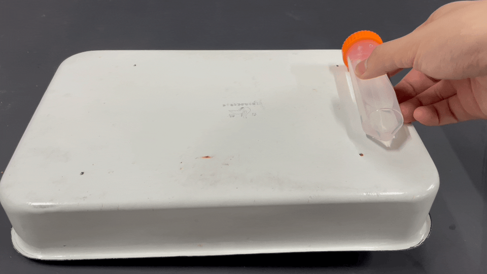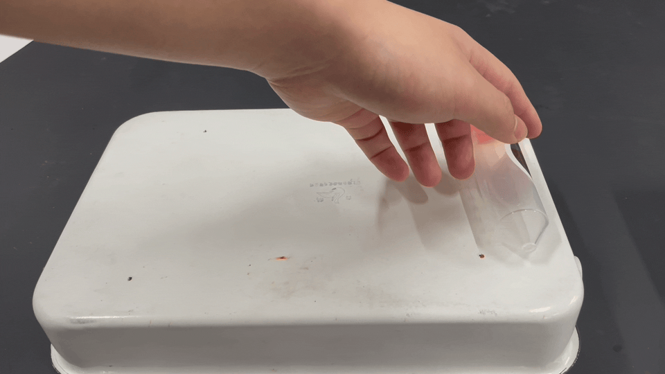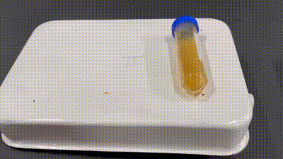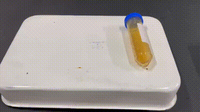 現在兔子嘴饞,喝了很多蜂蜜。(取另一個柱形容器,向其中加入一半的蜂蜜)。這時再讓兔子開始跑,可以發現,神奇的一幕發生了!它並沒有很快地滾下斜面,而是幾乎靜止在了斜面上,只能一步一步慢慢挪動。