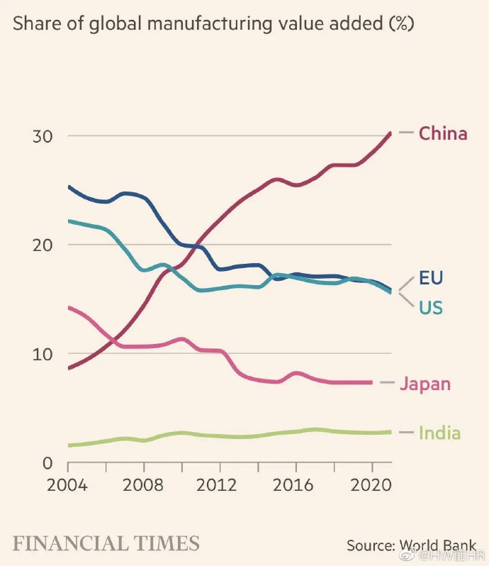 第一,中國製造業產值佔全球比例創新高,美國人要把製造業打跑的企圖落空了。美國人忍住通脹的痛苦,也要把製造業往中國外面搬走,和其僕從國推動中國+1戰略,就是不允許各國際大公司把中國作為大供應基地。但是因為中國供應鏈優勢,就是額外交20%關税,中國企業的優勢還是大於美國自己優勢。特別中國企業通過在東南亞設螺絲刀工廠,讓東南亞成為中國第一齣口市場,把順差從美國轉移到東南亞。結果中國製造業產值佔據全球比例越來越高,已經突破30%,超過G7之和。而一些被忽悠搬出去其他地方的歐美企業,發現表面成本降低,但是綜合成本更高,WSJ説一些美國企業又紛紛搬回中國。
