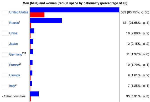 截至2022年世界各國航天員數量對比(紅色為女性),美國的領先優勢依然明顯,俄羅斯位居第二,但其中大部分數據(72人)屬於蘇聯時代(數據來源:wikipedia)