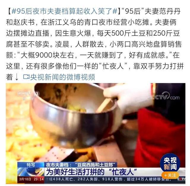近日,在浙江義烏擺攤的“豆腐西施土豆郎”日收入9184元的視頻走紅網絡。視頻中,忙活完一天的小兩口盤算當晚營業收入,興奮地説出一天賺了9184元的鏡頭令人印象深刻。喜歡算賬的網友認為,單日營業額能達到9000元不太現實。