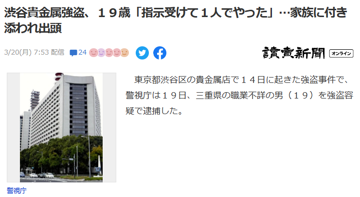 無獨有偶,3月14日下午6點40分左右,三重縣一名19歲的男子闖入澀谷區神南的一家珠寶店,拿着一把菜刀對着店長(一名20多歲的男子),威脅他要搶劫。他從收銀機和保險櫃中拿走約350萬日元的髒款,以及展示櫃中約100件物品,包括項鍊、手鐲和錢包,總市值價值為4000萬日元。