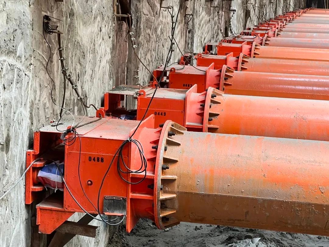 深基坑開挖萬無一失是地鐵建設人的匠心追求。經過分析研判,工程技術人員將原7道支撐加密為8道,支撐形式包含砼支撐、鋼支撐、“砼+鋼”複合支撐。此外,現場為96根支撐創新引入“TH-AFS”軸力伺服系統,最大限度發揮系統的自動化監測、無線傳輸、伺服控制等優點,實現由基坑細微形變自動調整軸力,為車站圍護結構提供全天候安全守護。截至目前,車站土方開挖107205方、架設鋼支撐328根,西端頭已順利見底。