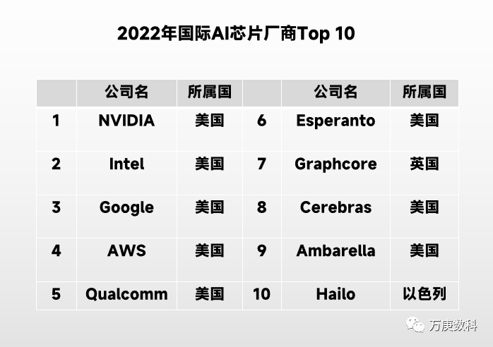 長期以來,我國在多個領域的核心技術上遭受發達國家“卡脖子”,AI芯片也是其中之一。在2022年國際AI芯片廠商前十名中,美國佔據8席,且前6名均為美國公司,牢牢控制着AI芯片的前沿發展方向,並在國際範圍內形成了對關鍵技術的壟斷。這也是OpenAI等美企對比他國企業在技術層面擁有近乎“降維打擊”的重要原因之一。反觀國內AI芯片技術水平,最先進的華為也僅排在第12位,距離前者有較大差距。仍需國家、企業放眼長遠,培養頂尖技術型人才,加大AI芯片研發投入力度,實現基礎研究與應用開發、商業化的同步。