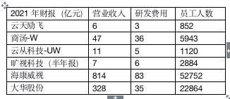 可以看出,2021年,雲天勵飛在收入規模、研發支出、員工人數方面均處於行業末位。隨着可比公司各自業務規模的不斷擴大、 產品線的不斷豐富、行業競爭將不斷加劇。